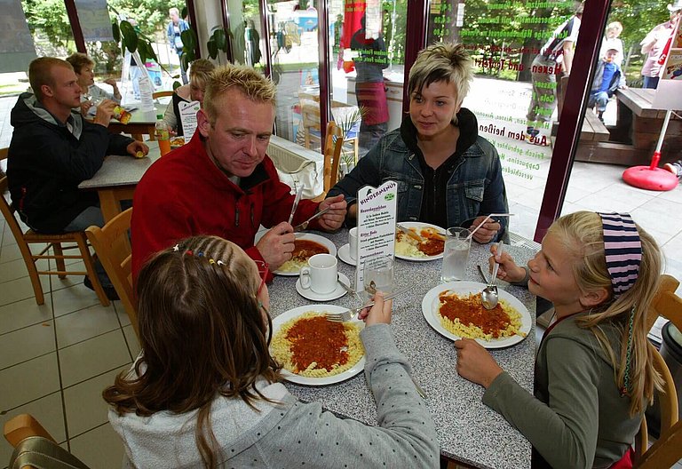 Ob Pommes, Spaghetti mit Tomatensoße oder eine leckere Erbsensuppe mit Bockwurst – das Angebot im »Hexenkessel« lässt kaum einen Wunsch offen. Natürlich können Sie hier auch Kaffee und Kuchen genießen und Erfrischungsgetränke gibt es ebenfalls zu familienfreundlichen Preisen.