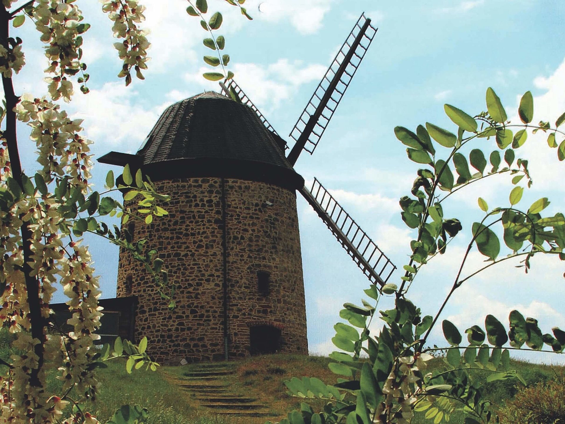 1938 Die tuchbespannten Flügel der aus Bruchsteinmauerwerk bestehenden Turmholländermühle drehten sich bis 1938 unermüdlich, bevor die unaufhaltsame Technisierung die Mühle arbeitslos machte.